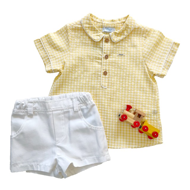 スペイン発!上品で洗練されたデザインに、高品質のお素材が大人気のブランド、FOQUE(フォケ) 太陽の国スペインならではの華やかな色使いに気分もパッと明るくなりますね。お出かけもますます楽しくなりそう♡ヨーロッパではギフトにもよく選ばれる、誰もが知るハイクオリティのブランドです。 ✎______________ ポコポコっとしたシアサッカー生地は、肌触りが良く風通しも抜群!スタイリッシュさと機能性を兼ね揃えたイエローチェックの半袖シャツ。同じ生地が使われているEmily frilly dressや、Agata flower dressとsiblings(兄妹)コーデも叶いますよ♡ お襟、お袖にはホワイトのパイピング、ウッドボタンとディテールまでしっかり作り込まれていて、さっと羽織るだけでオシャレ男子に♪ 別売の白のEnrique short pantsとのコーデはもちろん、デニムと合わせても素敵。 クーラーが強い室内でシャツの上から、ビーチやプールサイドで休憩中に…サッと羽織れて、1枚あるだけで全然違うアイテムです。 素材 綿50% ポリエステル48% ポリウレタン2% シャツ平置き実寸 着丈 身幅 2Y 40 - 31 3Y 44 - 32 5Y 47 - 34 6Y 49.5 - 37