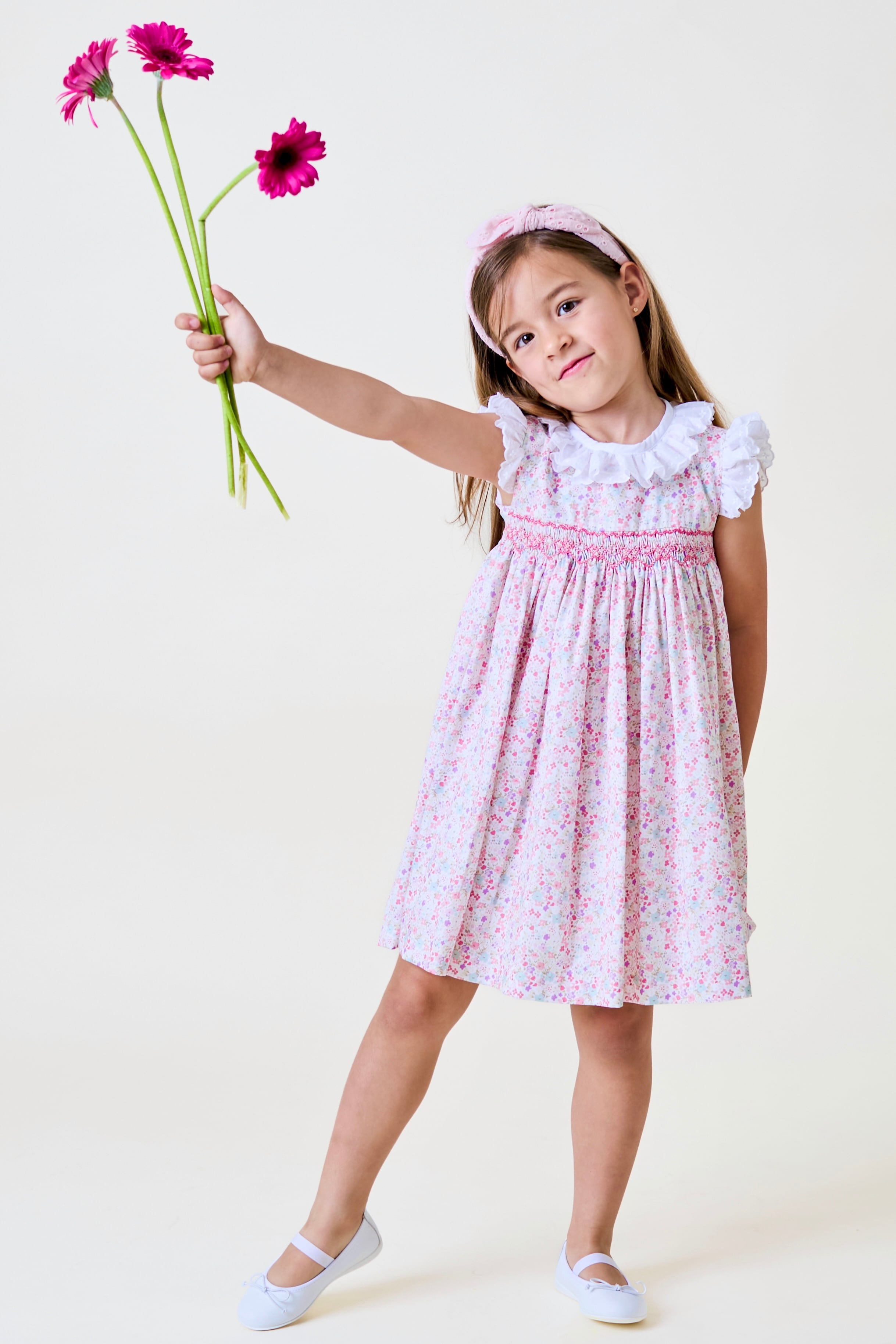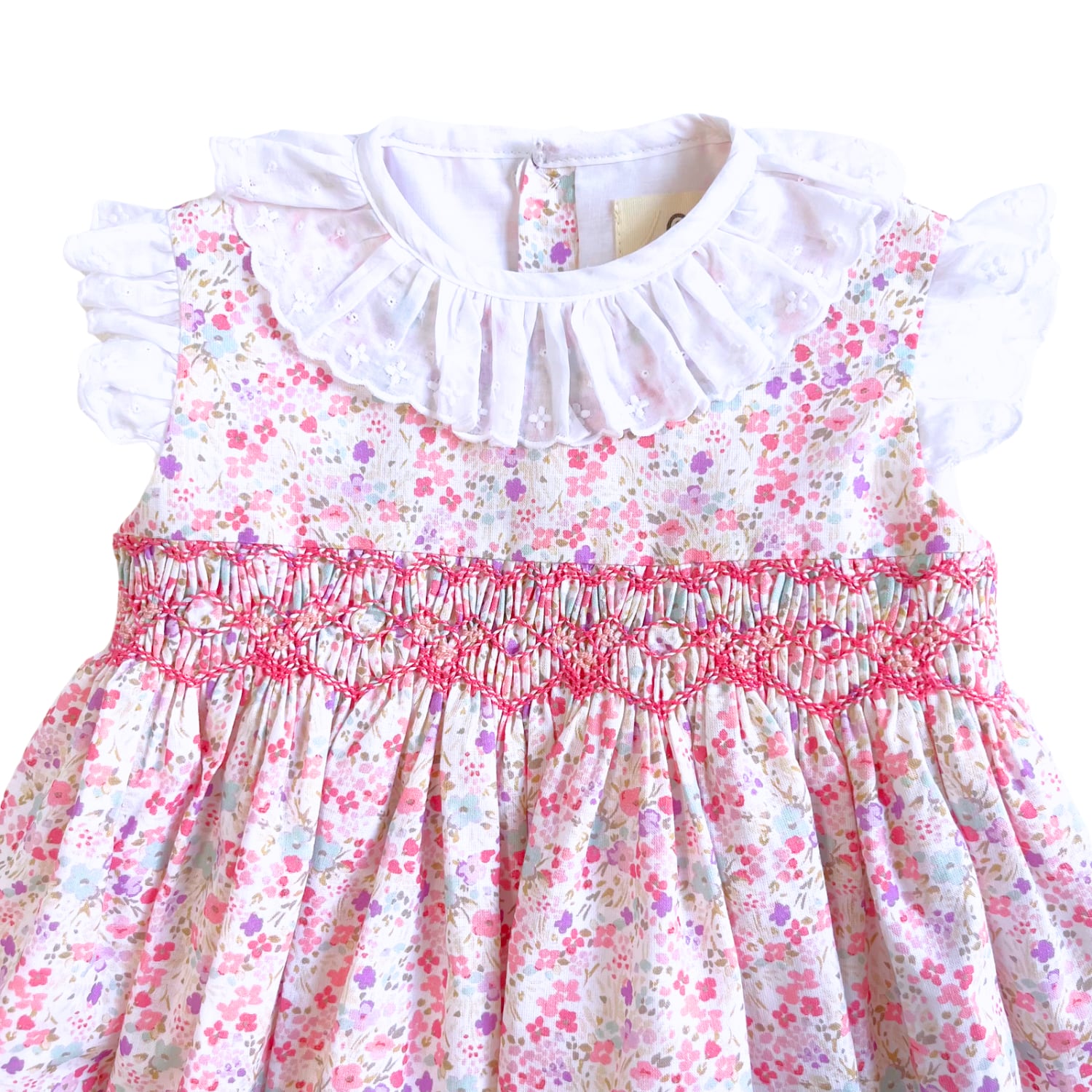 襟とお袖には白のフリル、胸元のスモッキングはハートの形が♡