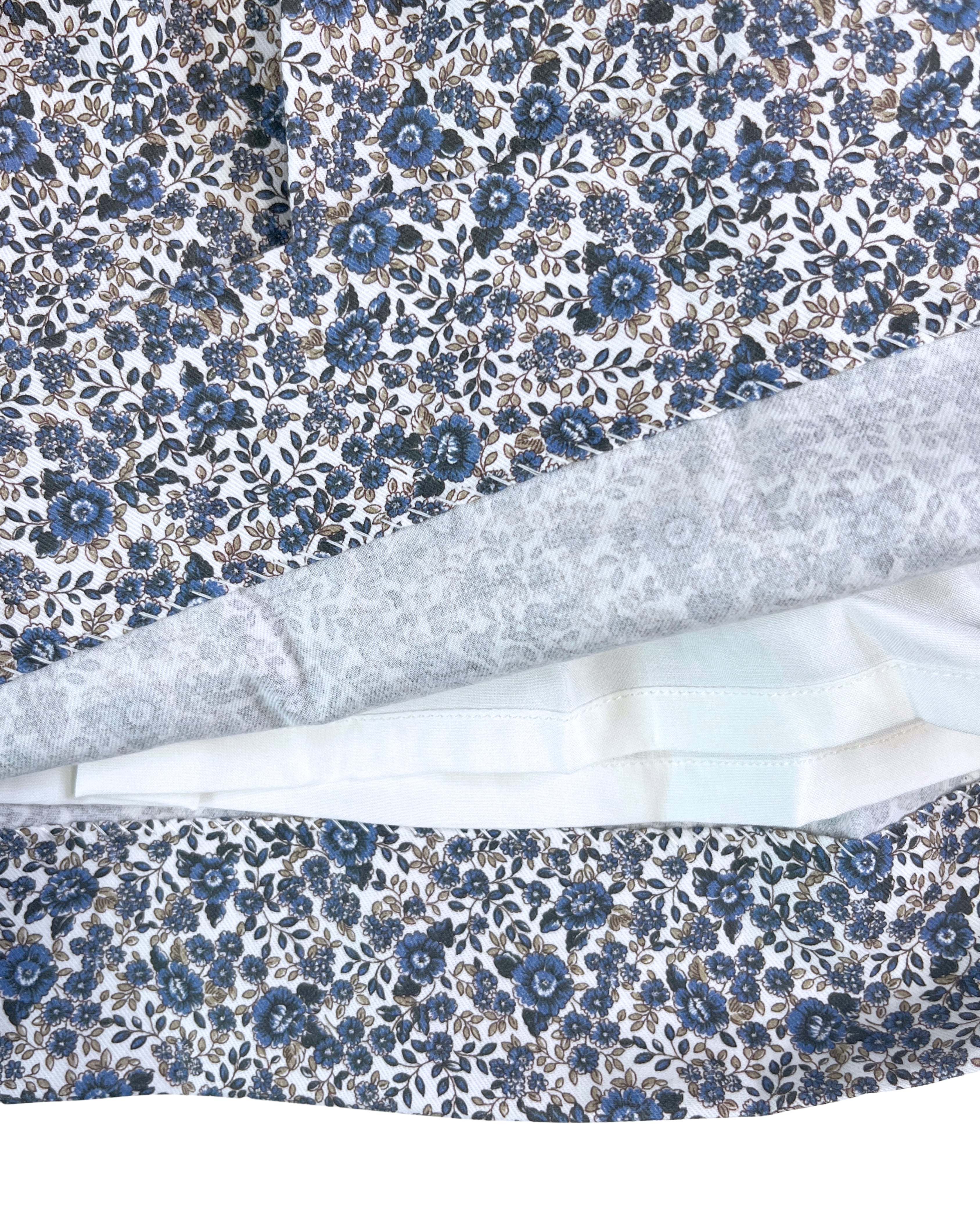 クラシカルなブルーフラワープリントが目を惹く、上品さと可愛らしさのバランスが絶妙なスモッキングワンピース。