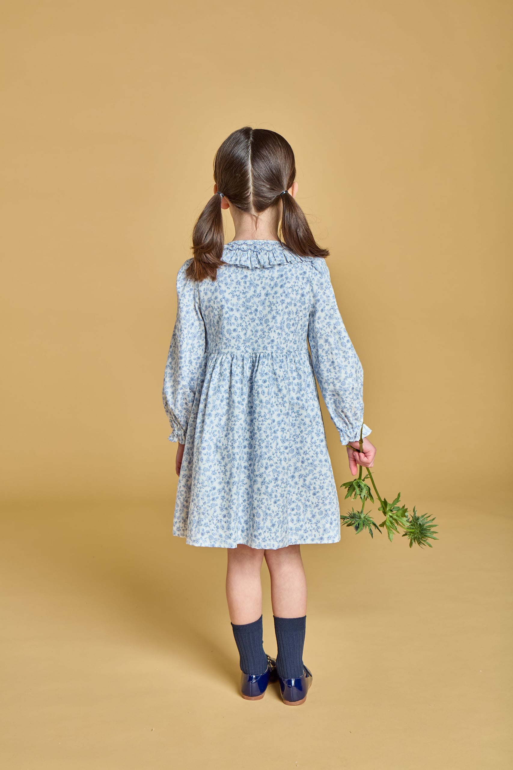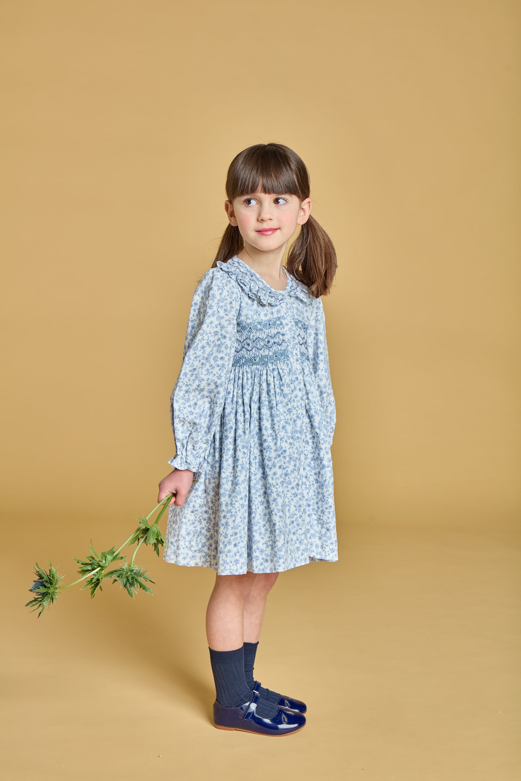 上品なブルーのフラワープリントに、思わず見惚れてしまうほど美しいスモッキングが映えるワンピース。