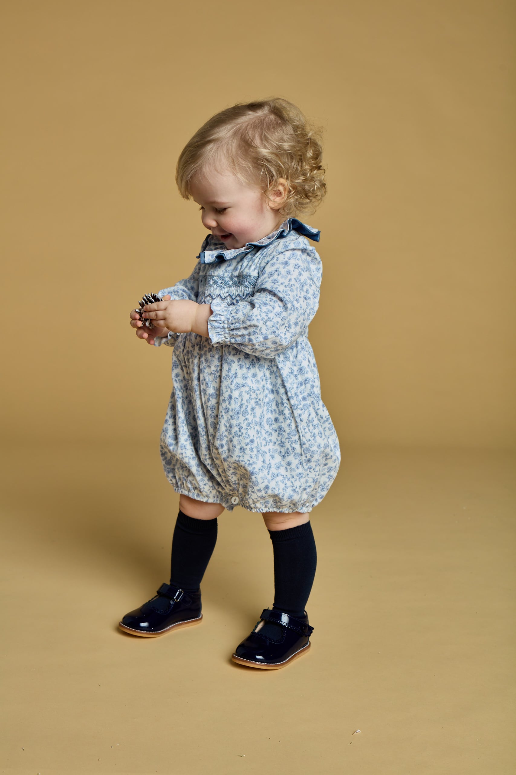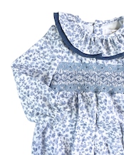 上品なブルーフラワープリントに、胸元のスモッキング刺繍が映える愛らしいロンパース。