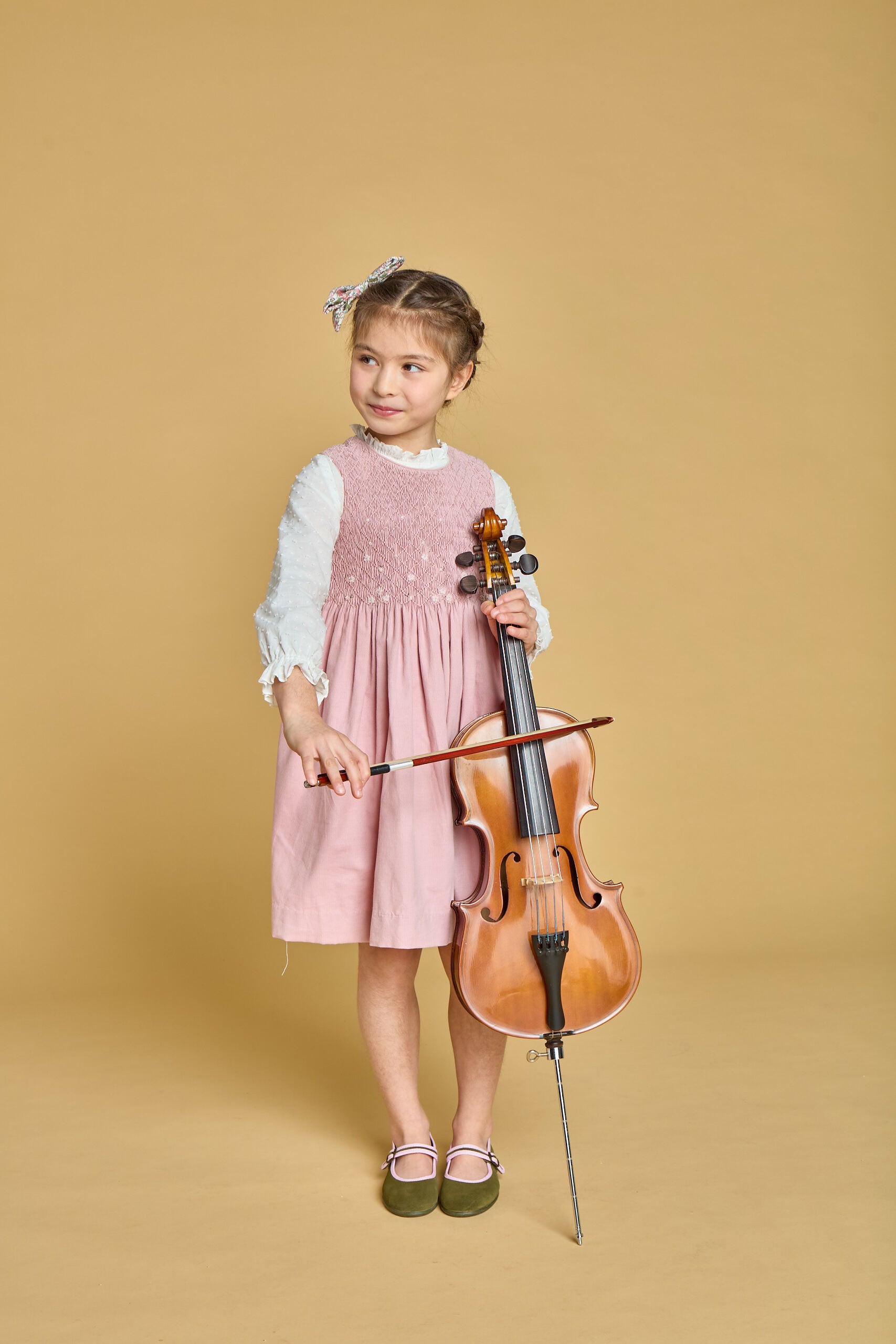 場が華やぐ上品なピンクの生地に、ふんわり広がるスカートはとても可憐な印象で、発表会や記念撮影など晴れやかなシーンにもぴったり。