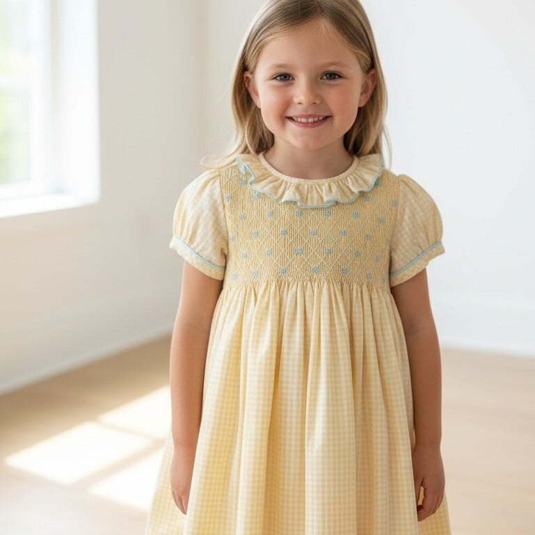 やわらかなイエローのギンガムチェックに繊細なスモッキング刺繍が素敵なワンピース。