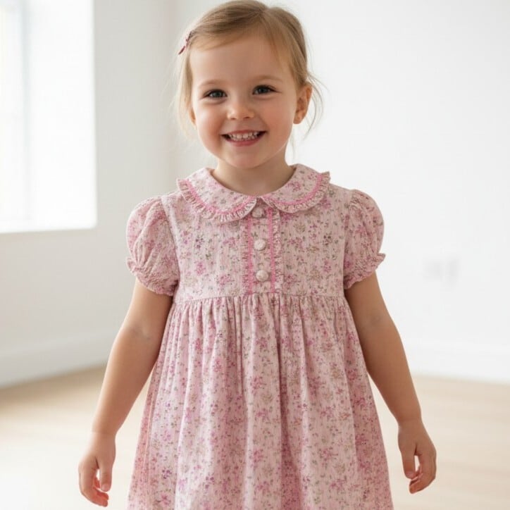 柔らかなピンクに小花柄の組合せがとびきりキュートなワンピース。
