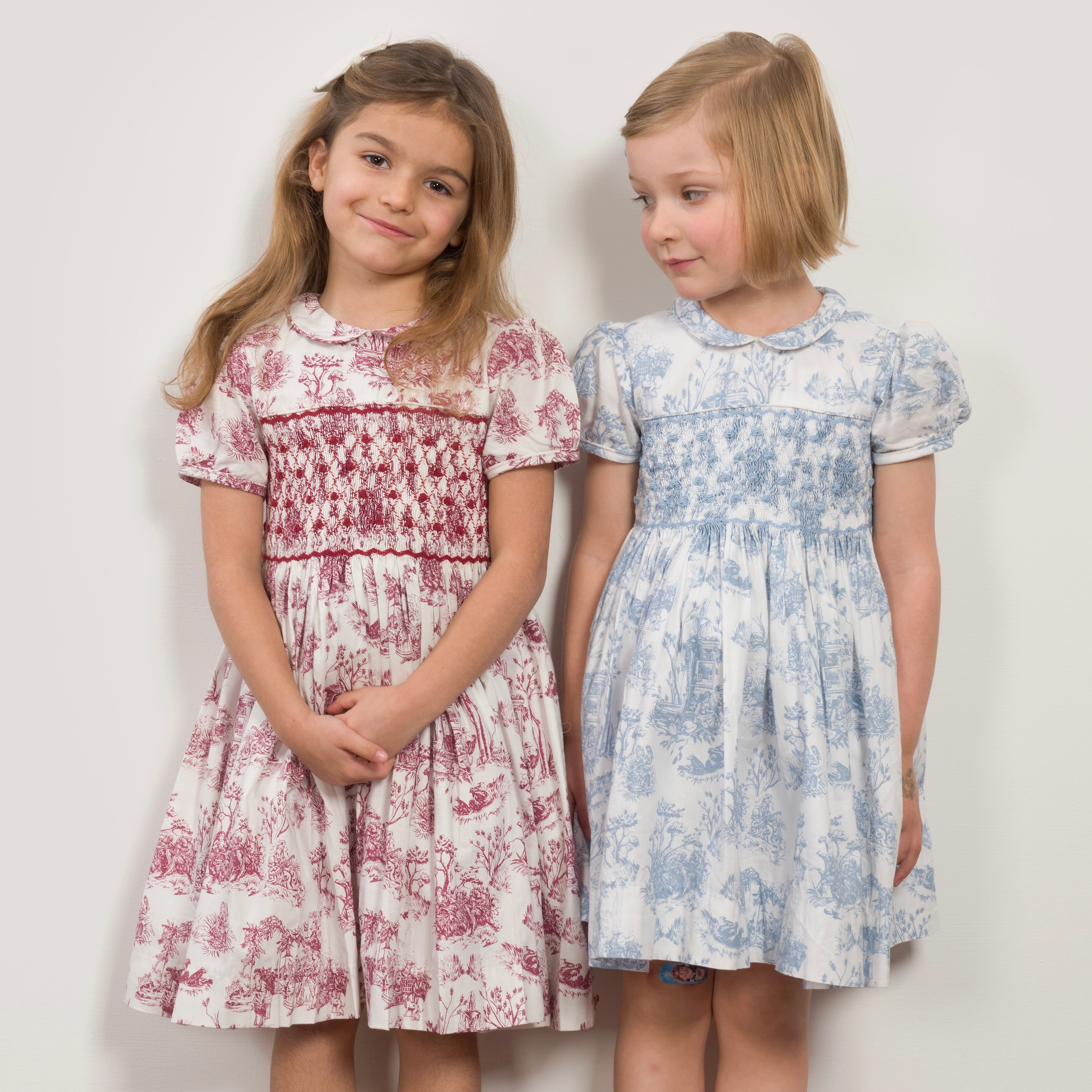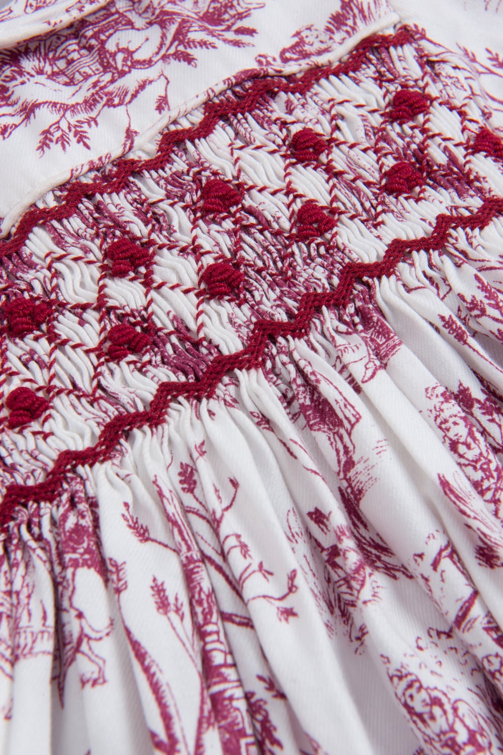 フランスの伝統的な生地、Toile de Jouy(トワルドジュイ)に、職人さんが一針ずつ手刺繍で施したスモッキングがとても美しいワンピースです。