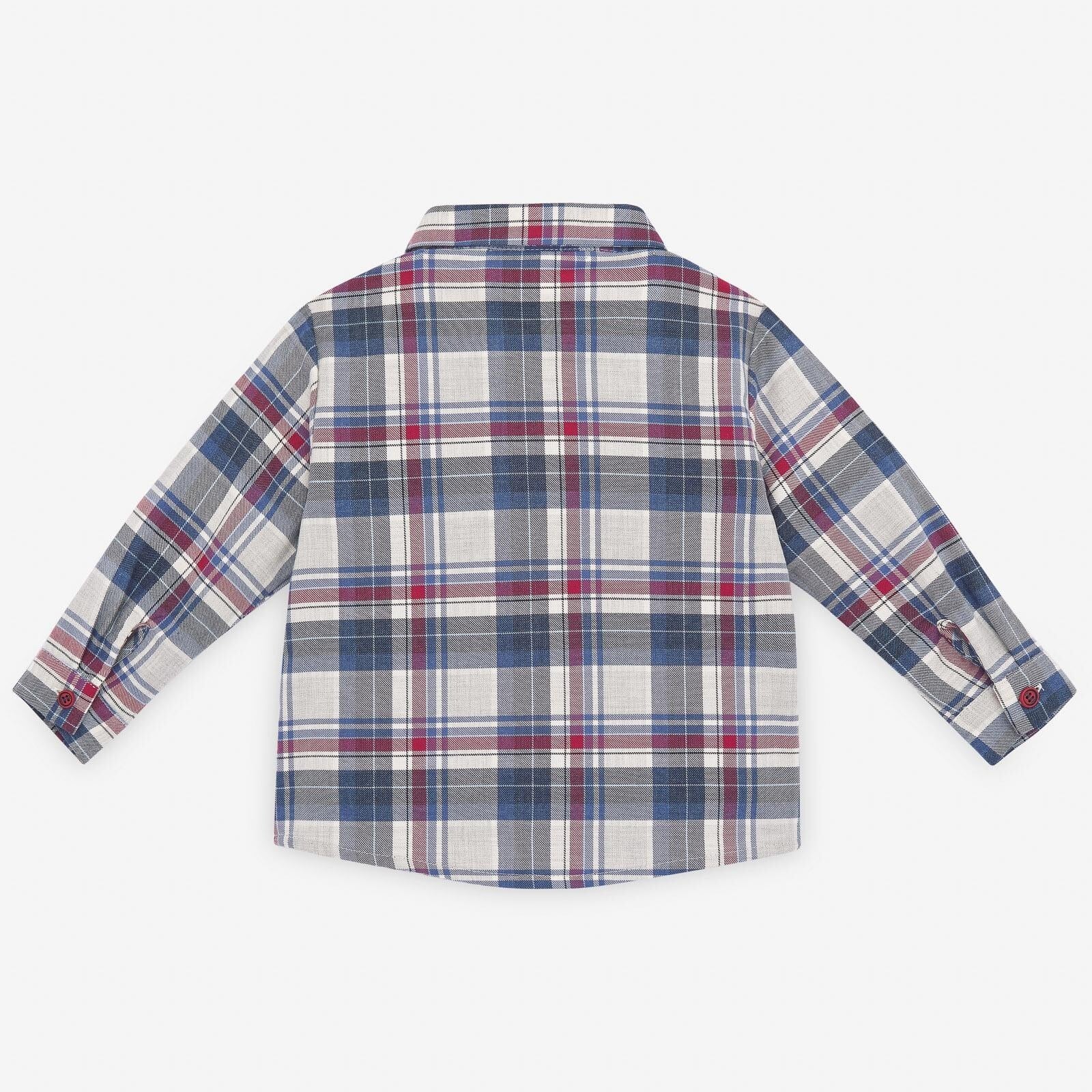 落ち着いた配色のマドラスチェックがトラッドな印象の長袖シャツ。グレーにブルー、レッドのタータンチェックとベーシックなカラーが入っているので、どんなお洋服にも合わせやすい♪