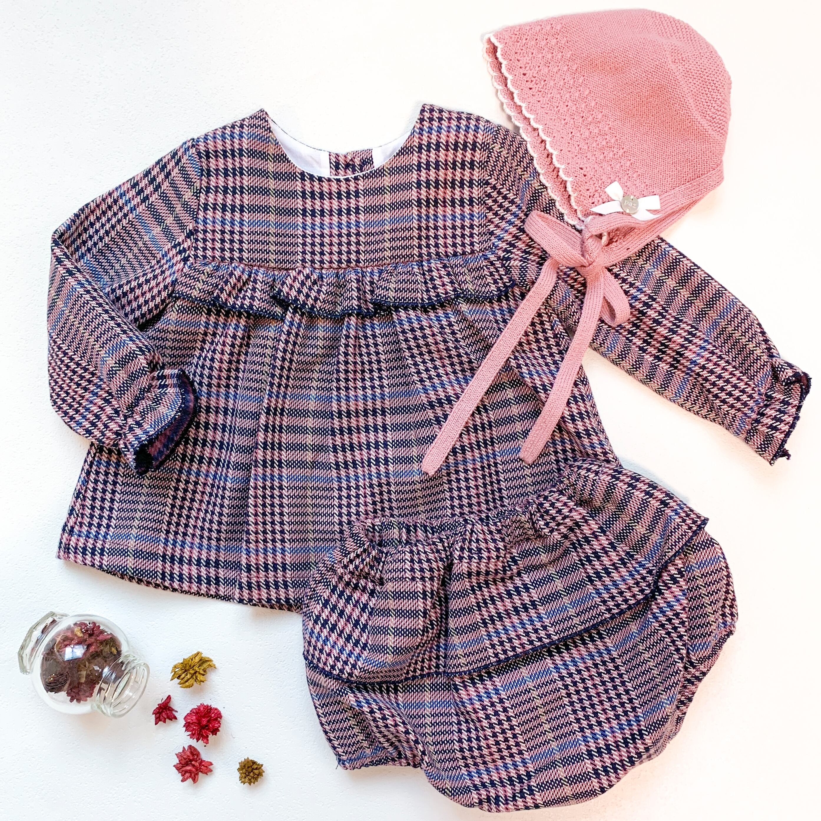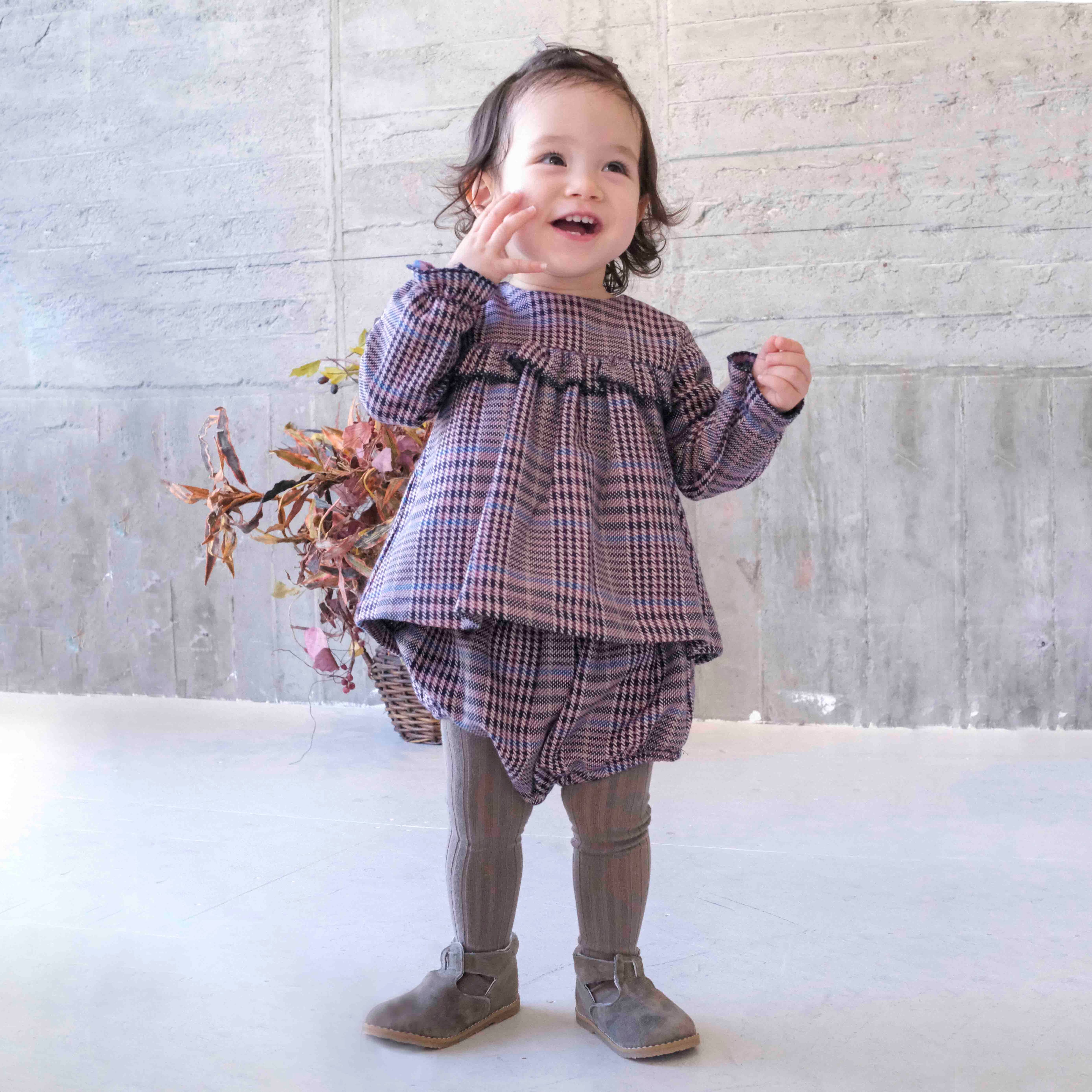 くすみピンクに、ブルー、ブラック、アイボリーで織りなされた、上品なタータンチェックの生地に、お袖と胸元のフリルがとっても可愛い、トップスとブルマのセット。