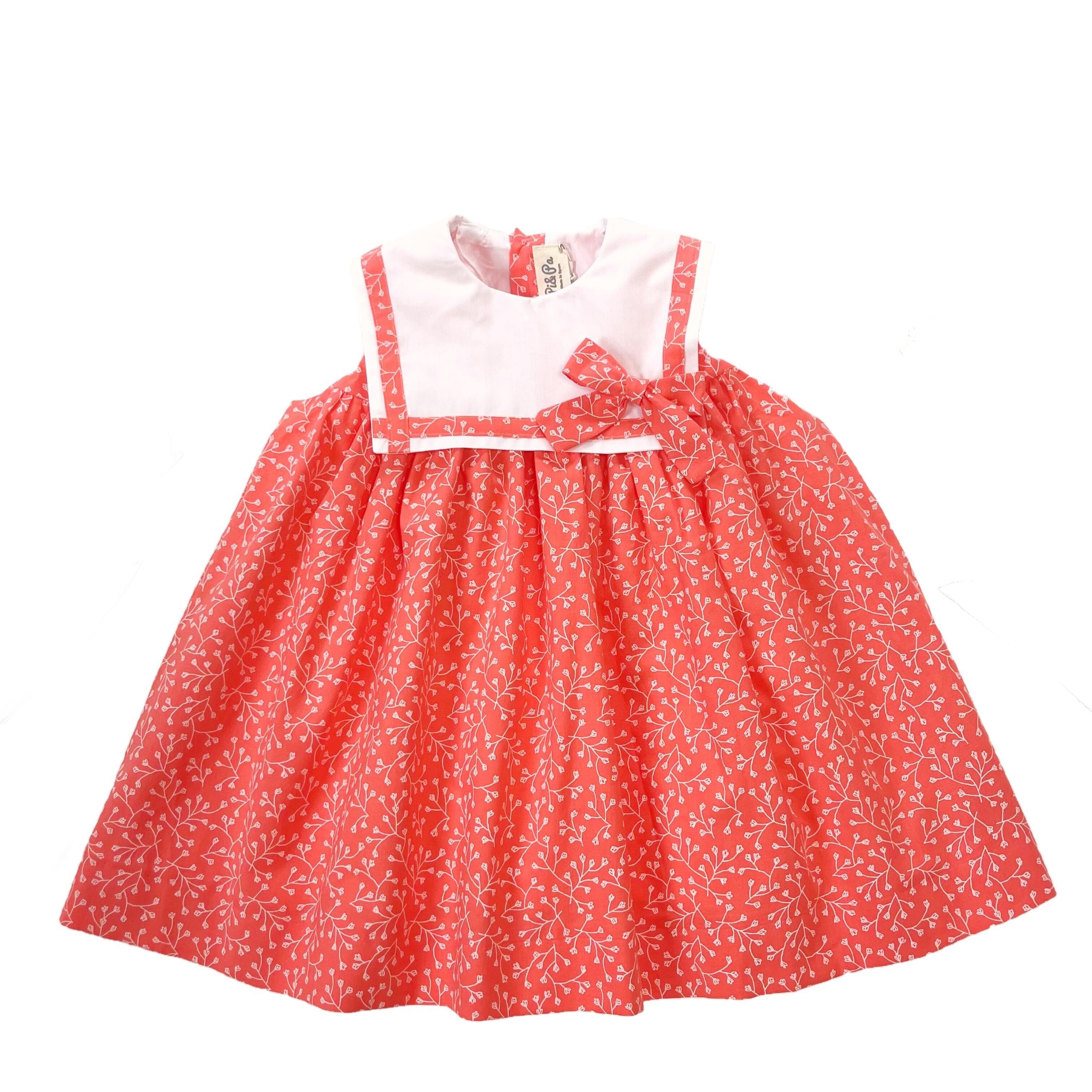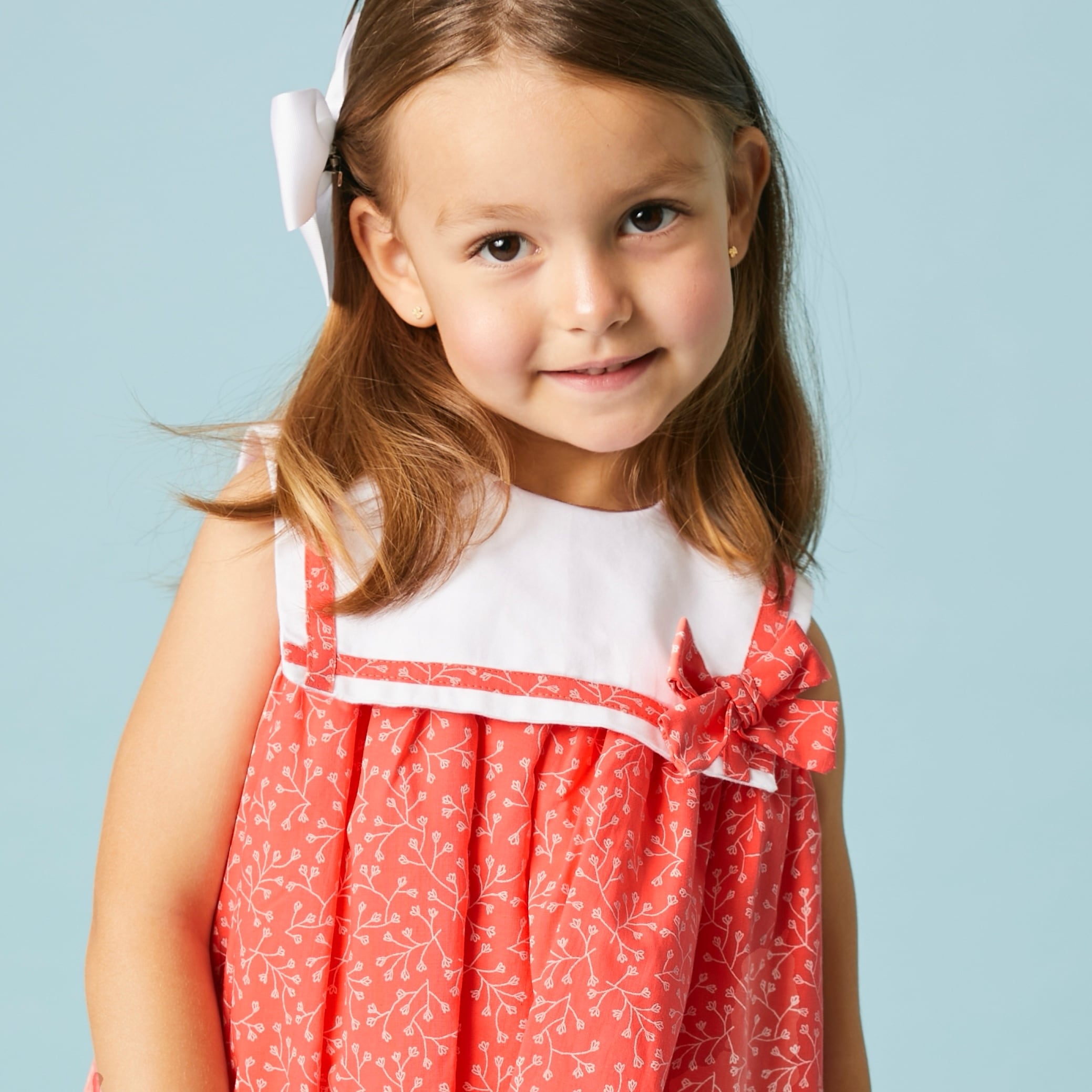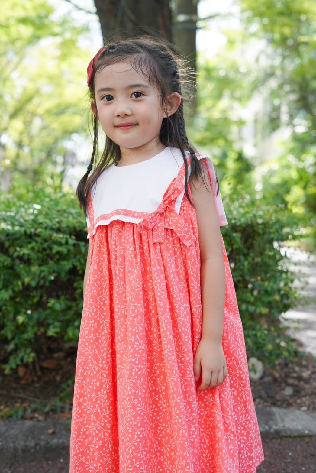思わず目を引くビビッドなコーラルカラーに、ホワイトのセーラー襟、ふんわりとしたシルエットが絶妙な組み合わせのワンピース♡